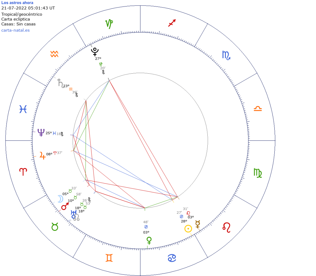 Estamos con configuraciones de catarsis. Con los nodos tauro escorpio que sigue proponiendo las transformaciones absolutamente directas y sobre todo en temas conyugales. Luna, Marte, Urano en Tauro. Saturno retrogradando en Acuario.