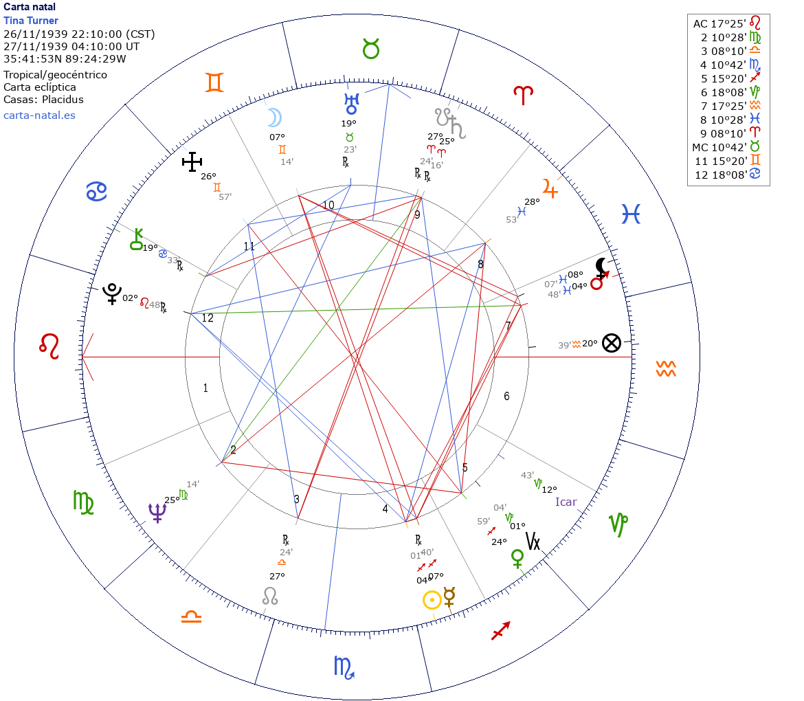 La Luna en casa 10 le otorga ser organizada, tomar acciones, liderarse a sí misma y llegar a ser una Digna Abuela; asteroide Icaro en Capricornio en casa 5 donde elevamos y expandimos el brillo del ego con creatividad. Ella será la GRANDIOSA ABUELA DEL ROCK . Gracias Tina, Anna Mae Bullock.