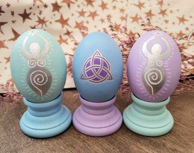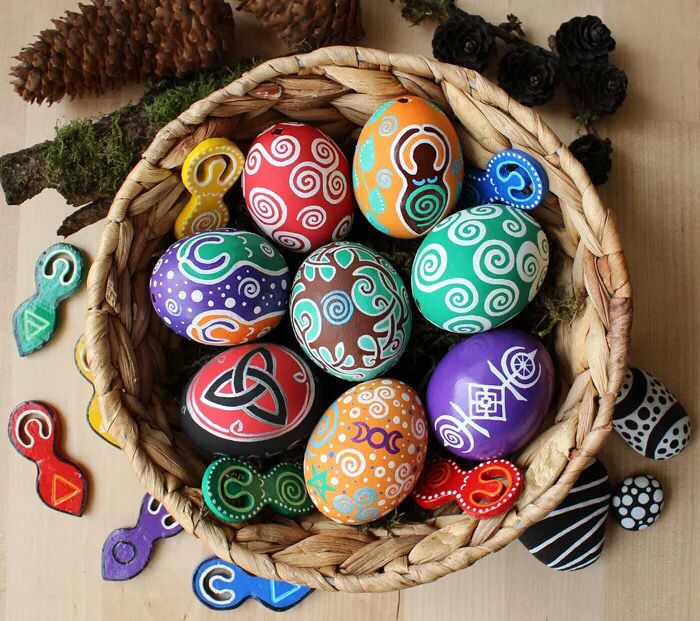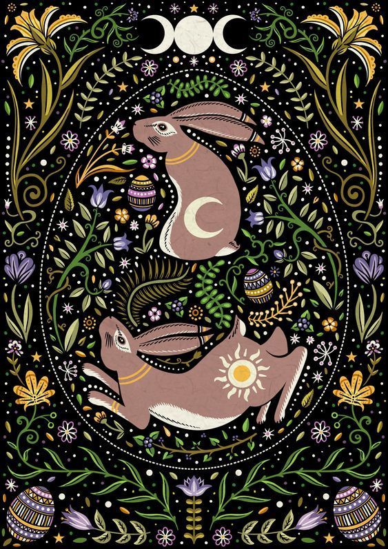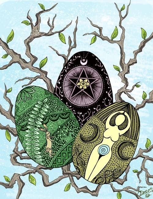 La Diosa examinó al animal y se dio cuenta que el pobre cuerpecito estaba tan desecho que no había mucho que hacer por la avecilla. Entonces Ostara recordó que una conejilla acababa de pasar a las Tierras de Verano y su cuerpo aun estaba cálido e intacto. Usando su magia, la diosa traspasó el alma del ave al cuerpo de la conejita. Los niños gritaron de alegría al comprender lo que había hecho la diosa. Pero pronto se dieron cuenta que la conejita estaba triste y llorosa y se lo señalaron a la Diosa. Ostara preguntó al animalito que le pasaba. “Pues, aunque estoy contenta de estar viva, estoy muy triste, porque ahora no podré poner huevitos, ni podré cantar y alegrar a los niños, ni volar hasta el tope de un árbol y salvarme del zorro,” dijo la asustada conejilla. “Haz algo Ostara, por favor, “ pidieron los niños. “No permitas que este triste.” Ostara meditó un momento y luego tomó a la conejilla entre sus manos. “A partir de ahora, pondrás huevos por estas fechas, para celebrar tu renacimiento y el renacimiento de la tierra. Y para alegrar a los niños, que fueron tus verdaderos salvadores, serán huevos de colores, dulces y hermosos, un regalo a la inocencia infantil que cree que todo es posible. Y cuando esta época pase, vivirás.